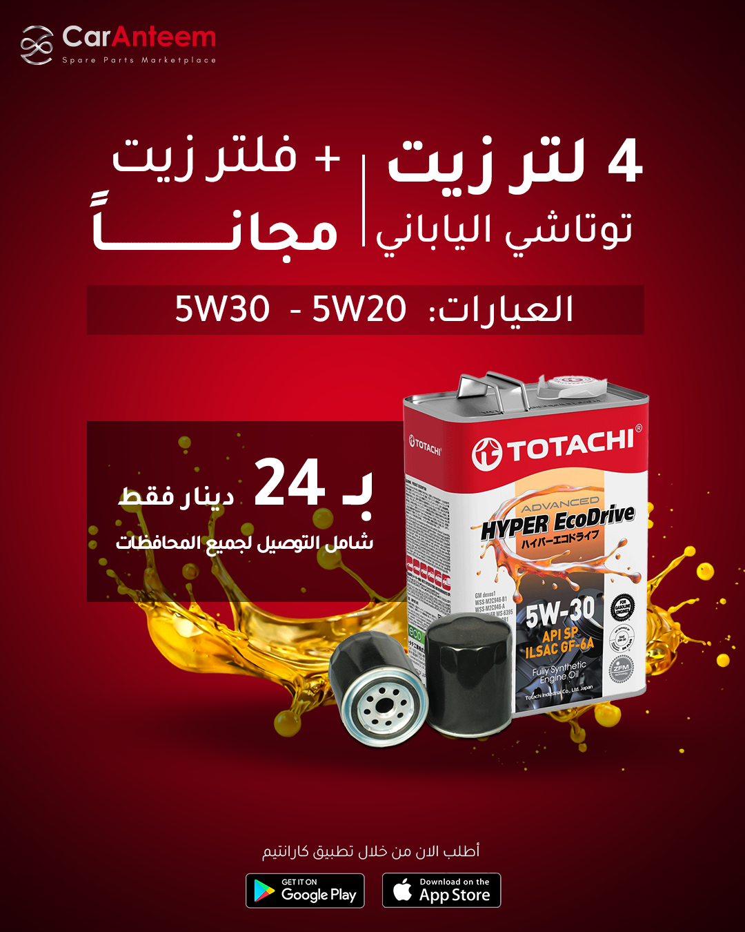 عرض حصري ، ٤ لتر زيت توتاشي فل سانثتيك، العيار ( 5W30 ) + فلتر زيت مجـــاني مطابق لسيارتك